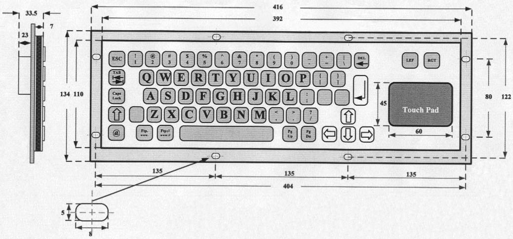Type: Vandal-proof Metal keyboard with TouchPad (protected keyboard) Dimensions: 392õ110 mm Additional: — 66 keys — To enter any data from any program — Compatible with Windows 98/ME/2000/XP — High level of protection makes this keyboard possible to be used in any crowded places — Cleaned easily — PS/2 - cabel — Caps Lock Indicator — Additional keys Page Up è Page Down — Functional keys F1 - F12 Material: — Front panel: stainless steel 304
